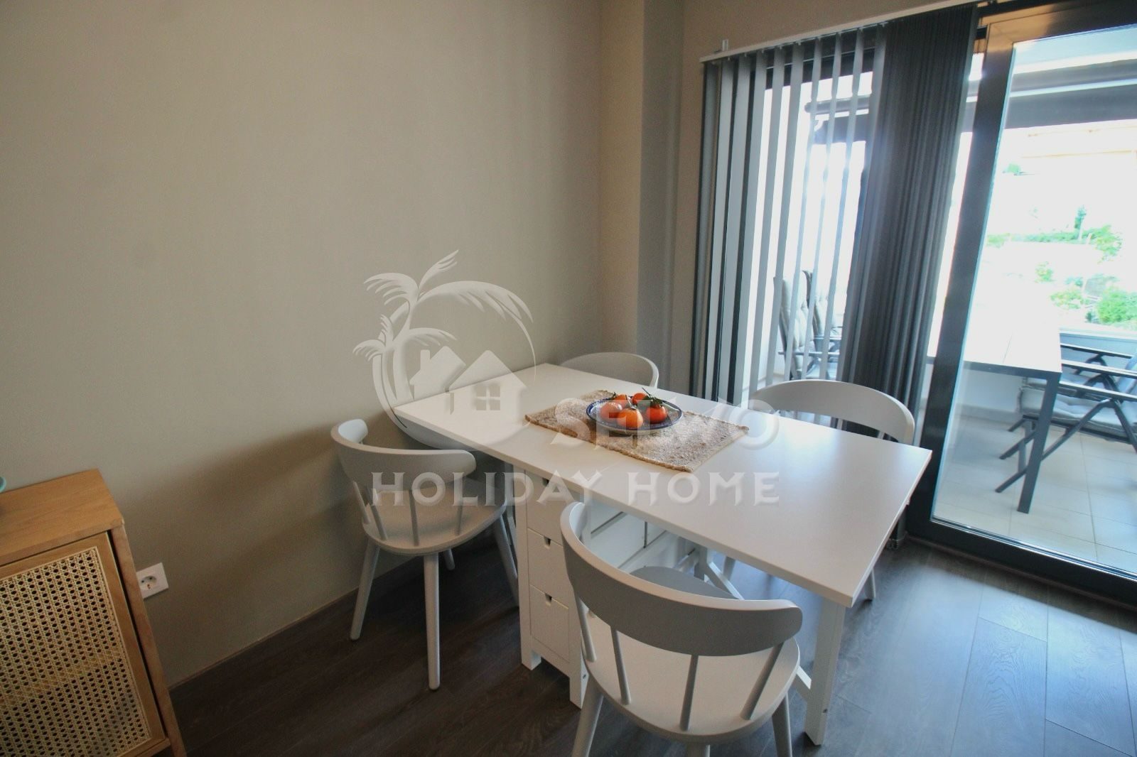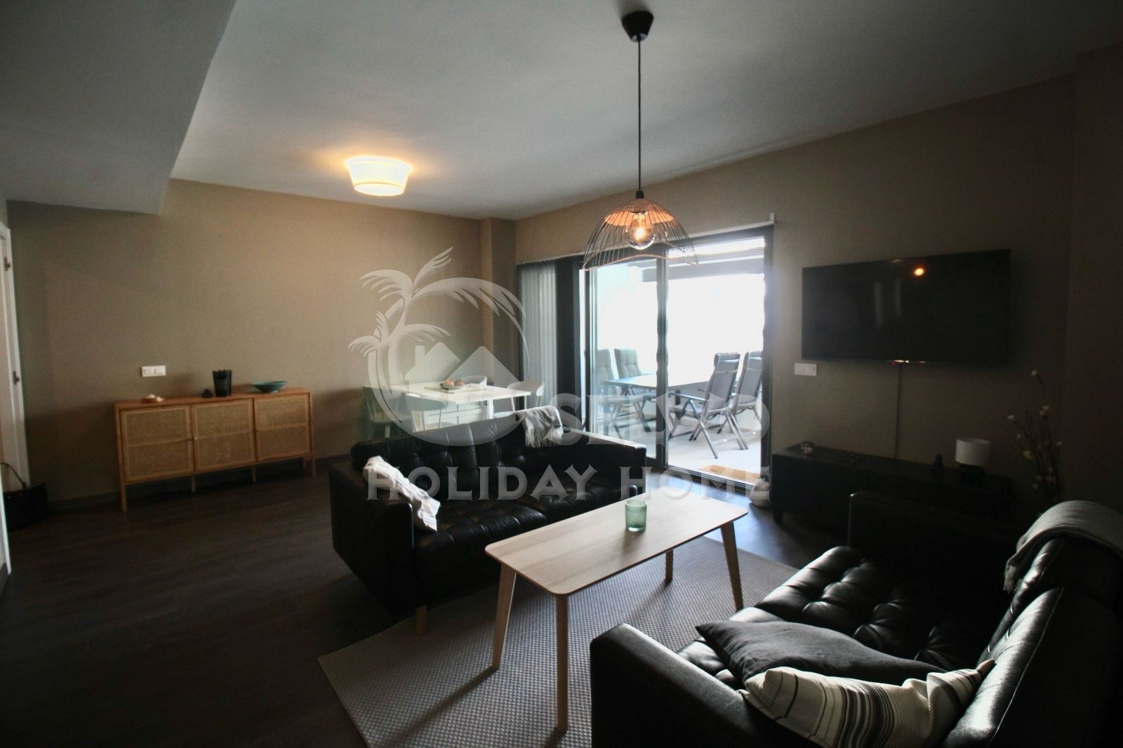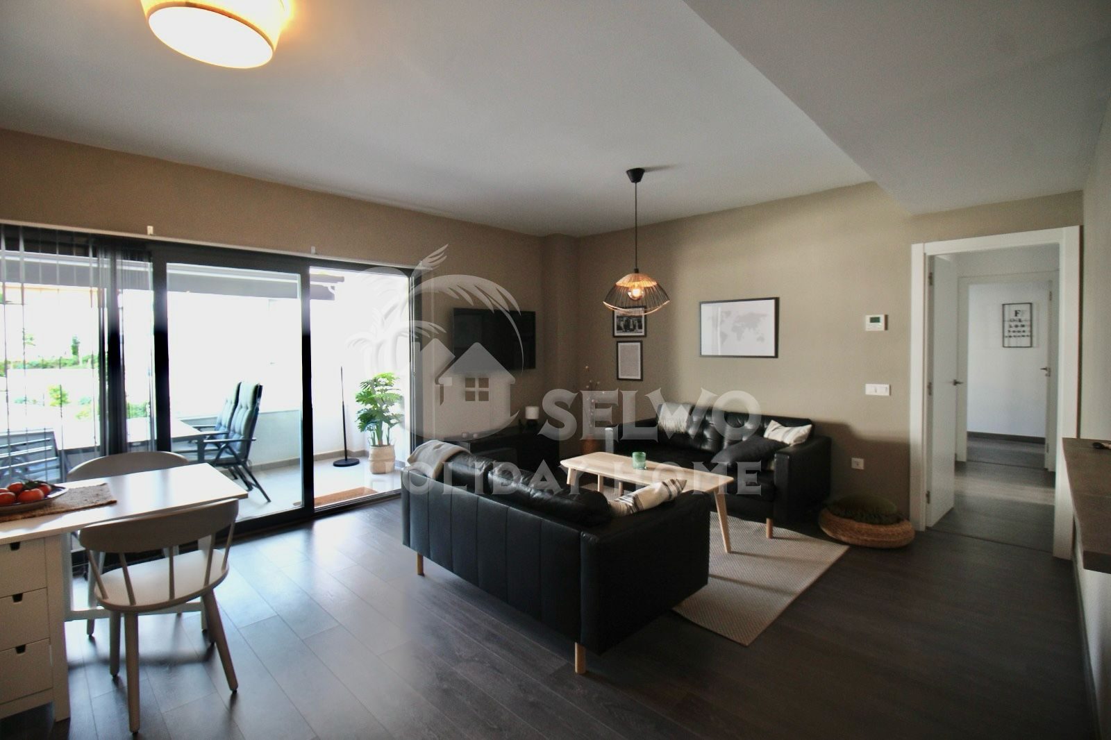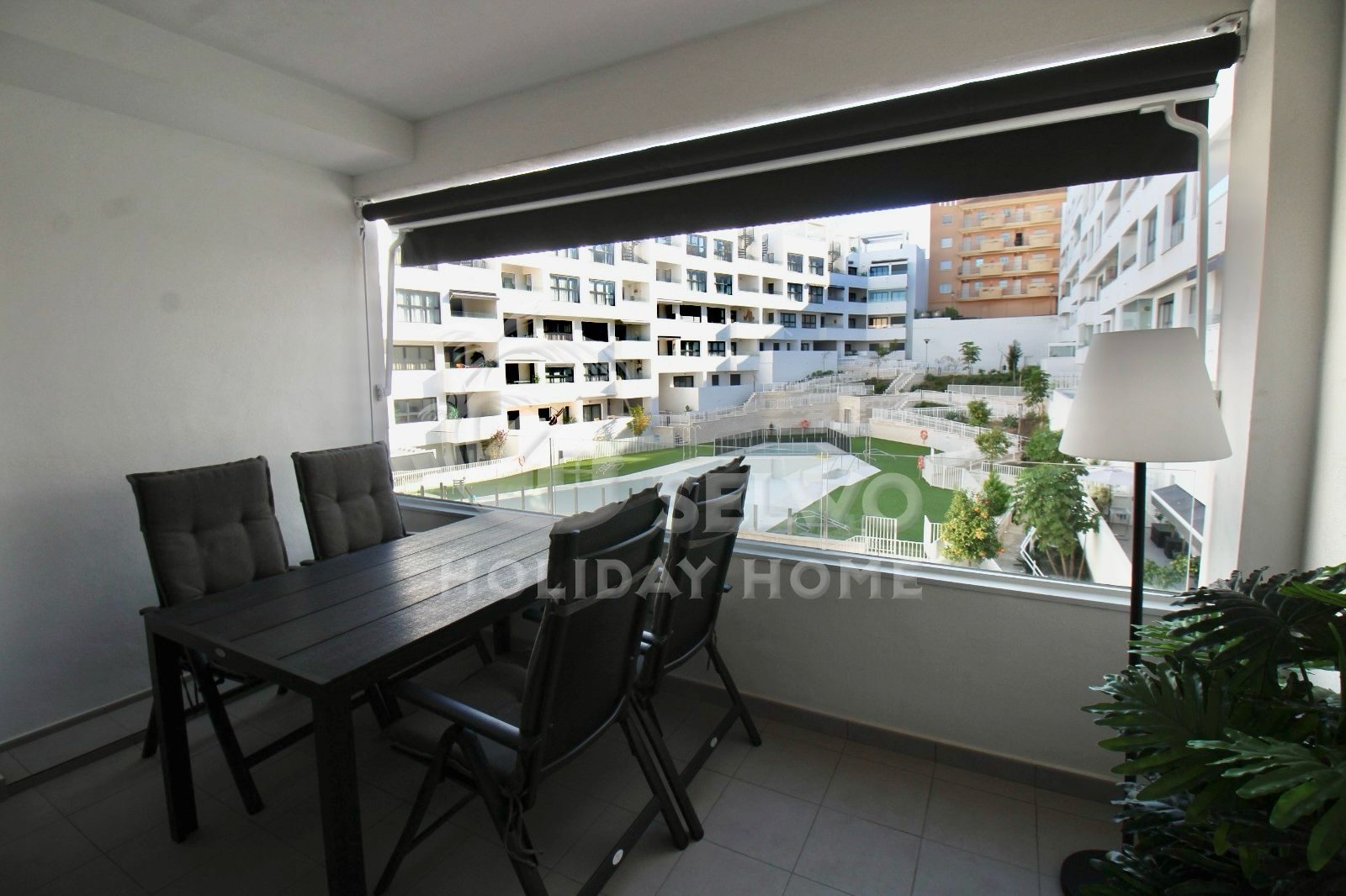 This modern apartment located in Pilar Bardem N12, a 10-minute walk from the centre of Estepona. It offers 2 bedrooms and two bathrooms and a balcony for al fresco dining or sunbathing. It is perfect for families due to the location and amenities. In the master bedroom, with a double bed. The second bedroom has a double bed. The kitchen is fully equipped for a functional holiday. There is also a separate laundry area with a washing machine. The balcony is facing the pool. The living room consists of a dining table with four chairs, two comfortable sofas and a flat-screen Smart-TV. The apartment is fully air-conditioned with a new efficient central system and has a high-speed fibre optic internet connection for your use. Within the urbanisation of Pilar Bardem, you will find the large communal swimming pool within walking distance.