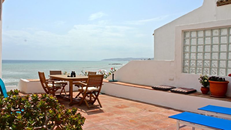 Amazing beachfront luxury villa with typical spanish surroundings at popular Bahia Dorada. This bright and airy 2 (3) bedroom duplex villa is situated right on the coastline. This is the villa’s first rental season having just completed a full renovation. The villa is tastfully designed with material in high quality straight thru. On the groundfloor you have an open plan solution including a fully equiped kitchen in highstandard, a diningarea and a huge lounge area with a fireplace. The terrace doors leading out to two private terraces with good size (not overlooked). From the terrace you have amazing views of the Mediterranean. On the first floor you also have a small bedroom and a toilette. Upstairs you have two bedroom with two en-suite full sized bathroom with a walk-in shower. Both bedrooms has full size 90×200 single beds that can be set together as a180x200 twinbed or be placed as single beds, just as you like. One of the bedroom has a lovely terrace with fantastic view over the sea. The villa is full of details which makes it stand out that little extra. The design is in typical Andalucian style with a modern twist. All done with fingertips and quality thinking. The villa is placed in a quiet urbanization that offers 5 swimming pools, a tennis court and free car parking. It’s a beautiful space to relax, enjoy and spend time in perfect harmony with nature. Nearby you also have a bar/restaurante just a few minutes walk away. It’s recommended to have a car during your stay here.