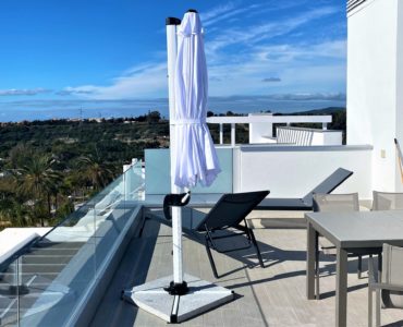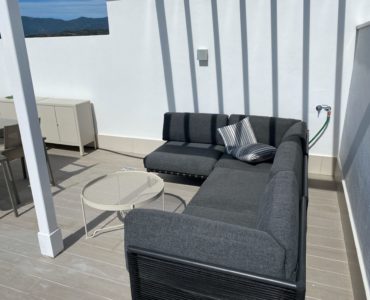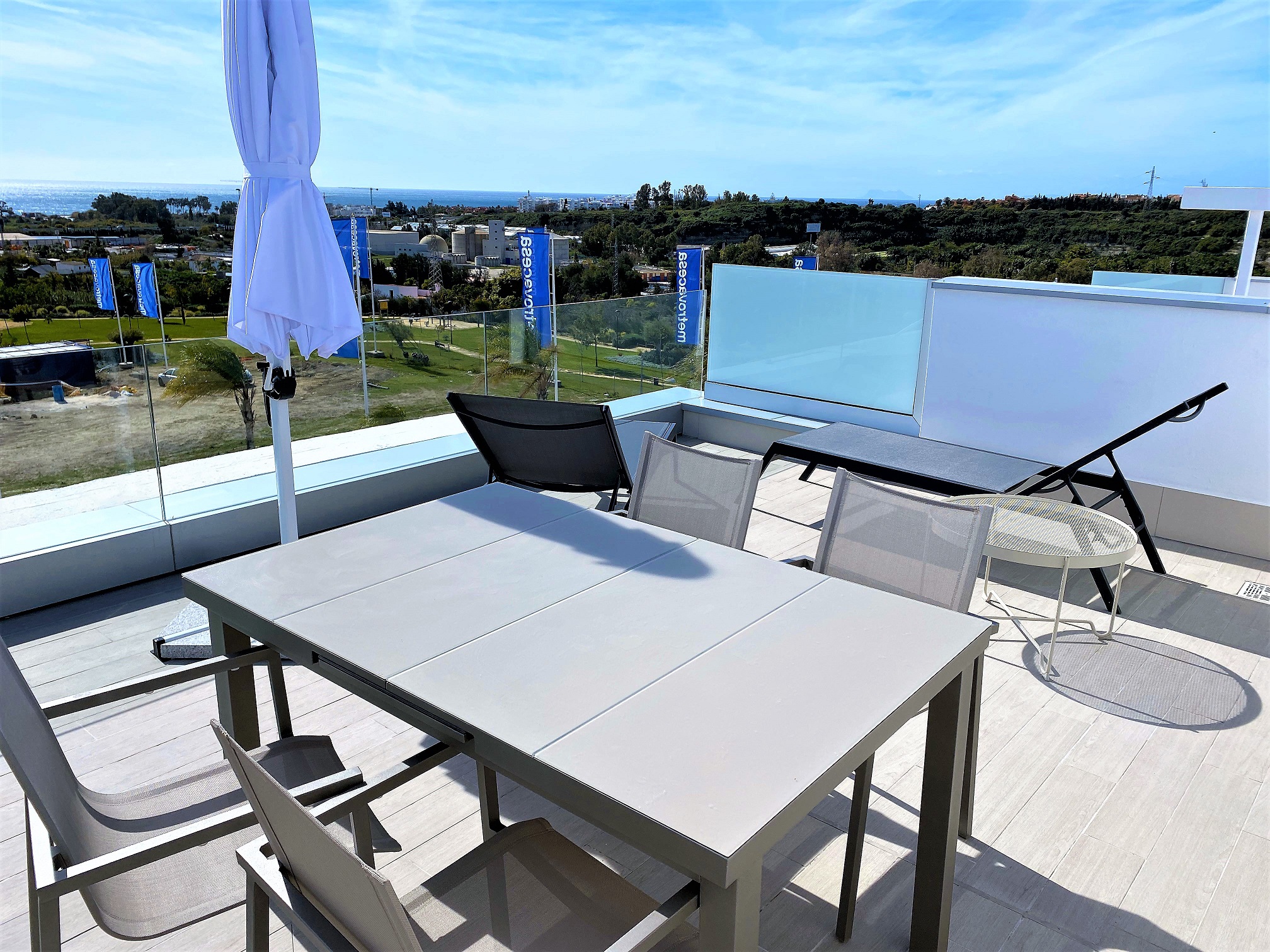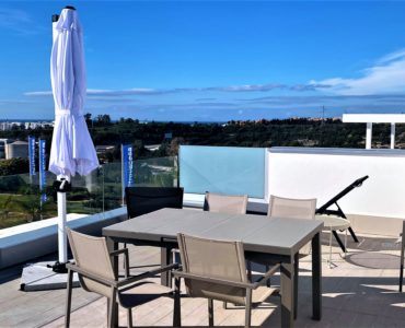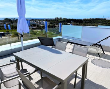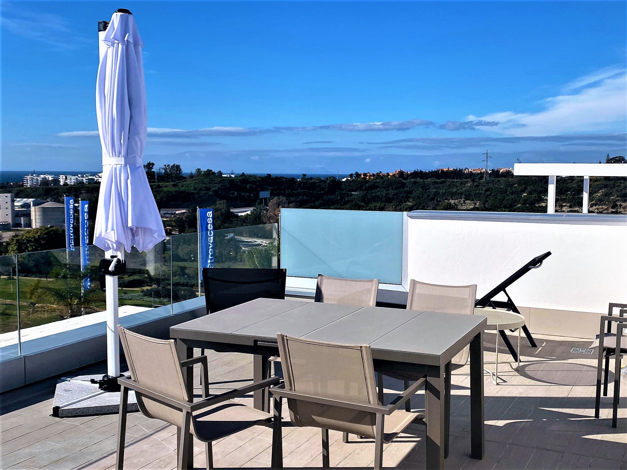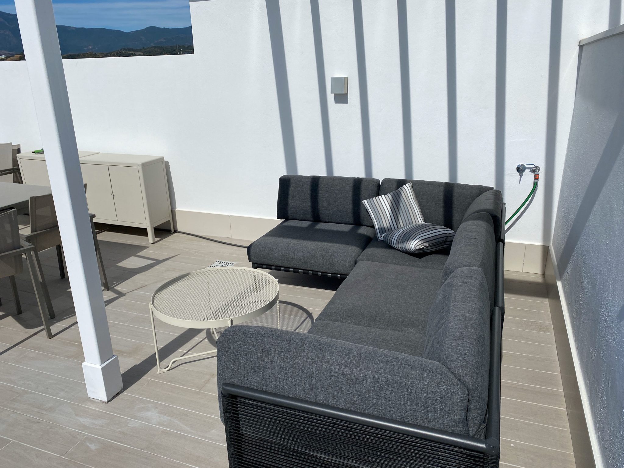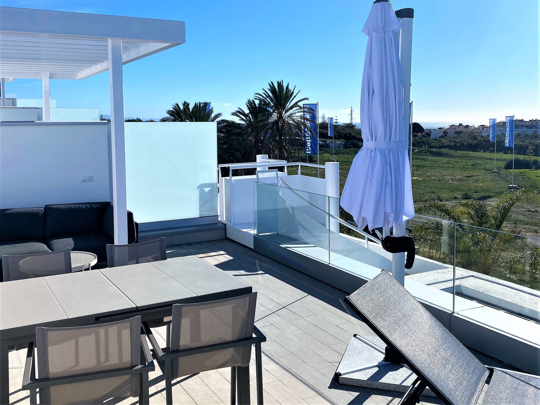 Nybyggt penthouse på ”New Golden Mile”. Perfekt läge med gångavstånd till ett brett utbud av bekvämligheter i den charmiga byn Cancelada, de gyllene stränderna och nära flera golfbanor. Penthouset har 2 sovrum samt 2 badrum, öppet kök och är byggt i högsta standard. Köket är fullt utrustat för en bekväm semester. Från vardagsrum/kök har ni access till en härlig terrass med plats att äta och koppla av. I tillägg finns det även en takterrass med matbord, solstolar och en lounge area, perfekt för härliga sommarkvällar/nätter. Från takterrassen har ni en fantastisk utsikt utöver medelhavet, med Gibraltar och Marocko i bakgrunden och även de vackra solnedgångarna bortom bergen.